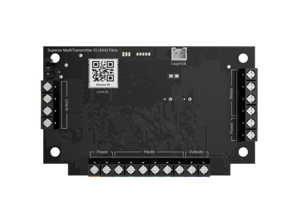 Superior MultiTransmitter IO (4X4) Fibra je **drátový modul se 4 vstupy a 4 výstupy**, navržený pro integraci zařízení třetích stran do systému Ajax. Vdechněte nový život zastaralému vybavení a připojte zařízení mimo portfolio Ajaxu, abyste vytvořili chytrý zabezpečovací systém pro projekty jakékoli složitosti. Přináší nesrovnatelný zážitek z Ajaxu na produkty třetích stran s ovládáním zabezpečení v aplikaci, automatizačními scénáři a informativními notifikacemi.