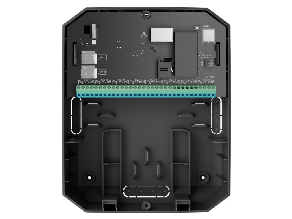 Hybridní ústředna podporující provoz jak na drátových protokolech Fibra, tak na bezdrátových Jeweller a Wings, s možností připojení pomocí 2G sítě.