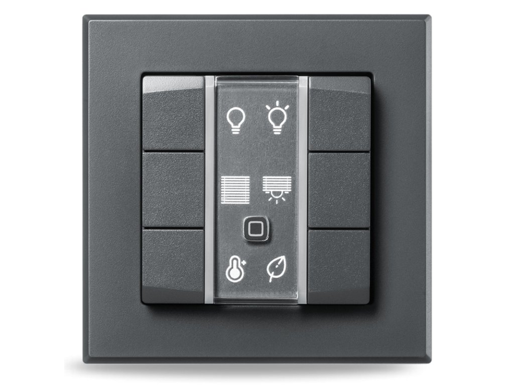 Šest intuitivních tlačítek umožňují pohodlné ovládání zařízení nebo systémových funkcí v systému automatizace a řízení budov. Například umožňují zapínat a vypínat světelné zdroje, aktivovat a deaktivovat ekologický režim nebo zvedat a spouštět rolety.