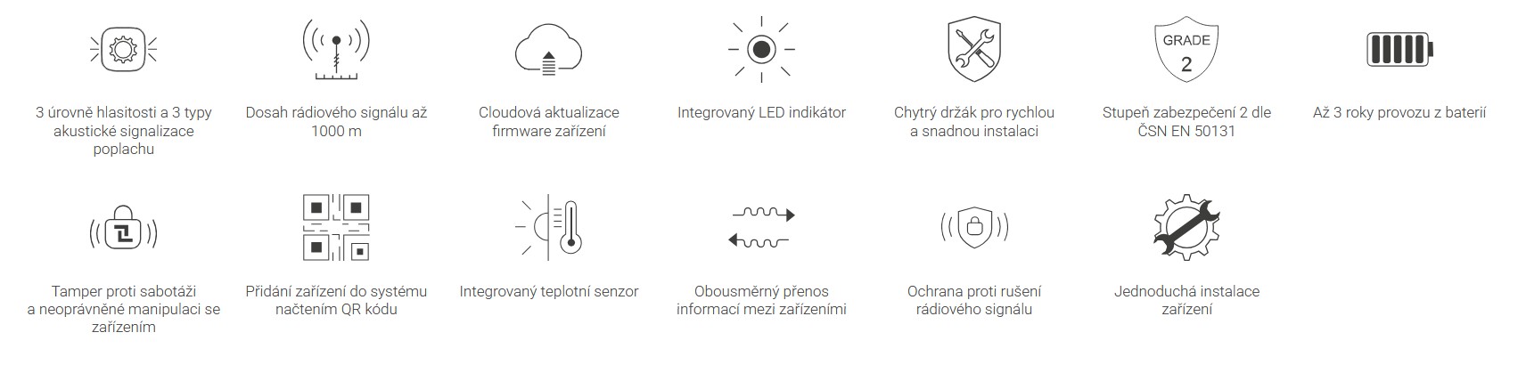 Bezdrátová interiérová siréna pro poplachové systémy. Nabízí 3 úrovně hlasitosti a 3 typy tónů signalizace. Interval akustické signalizace poplachu je nastavitelný. Podporuje signalizaci vstupního a odchodového zpoždění. Provoz na baterii až 3 roky.