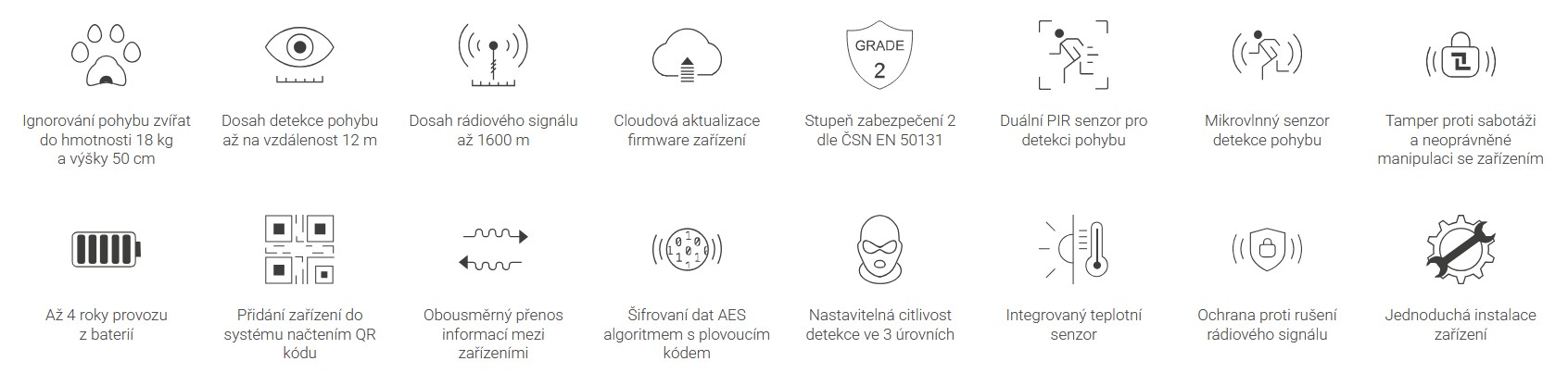 Bezdrátový duální PIR detektor pohybu s mikrovlnným senzorem detekující pohyb až na vzdálenost 12 metrů, který je schopen spolehlivě ignorovat pohyb zvířat ve střeženém prostoru (PET imunita) do hmotnosti 18 kg a 50 cm výšky. Detektor je napájen vyměnitelnou baterií typu CR123A, která umožňuje nepřetržitý provoz detektoru po dobu až 4 let.