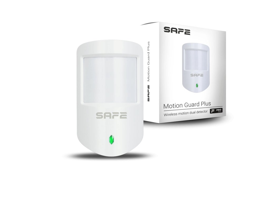Motion Guard Plus je bezdrátový duální PIR detektor pohybu s mikrovlnným senzorem detekující pohyb až na vzdálenost 12 metrů, který je schopen spolehlivě ignorovat pohyb zvířat ve střeženém prostoru (PET imunita) do hmotnosti 18 kg a 50 cm výšky. Díky šifrovanému komunikačnímu protokolu SAFE Keeper zajišťuje bezpečné spojení s centrální ovládací jednotkou zabezpečovacího systému SAFE až na vzdálenost 1 600 metrů v otevřeném prostoru. Detektor je napájen vyměnitelnou baterií typu CR123A, která umožňuje nepřetržitý provoz detektoru po dobu až 4 let.