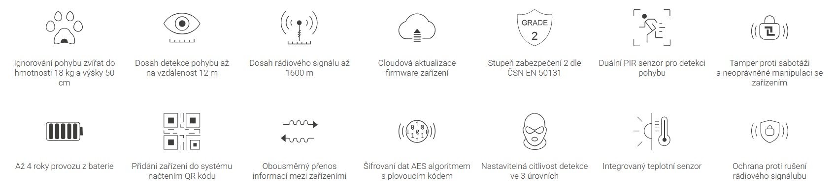 Bezdrátový detektor pohybu vybavený duálním PIR senzorem detekující pohyb ve vzdálenosti až 12 metrů, PET imunita do hmotnosti 18 kg a 50 cm výšky. Detektor je napájen vyměnitelnou baterií, která umožňuje nepřetržitý provoz detektoru po dobu až 4 let.