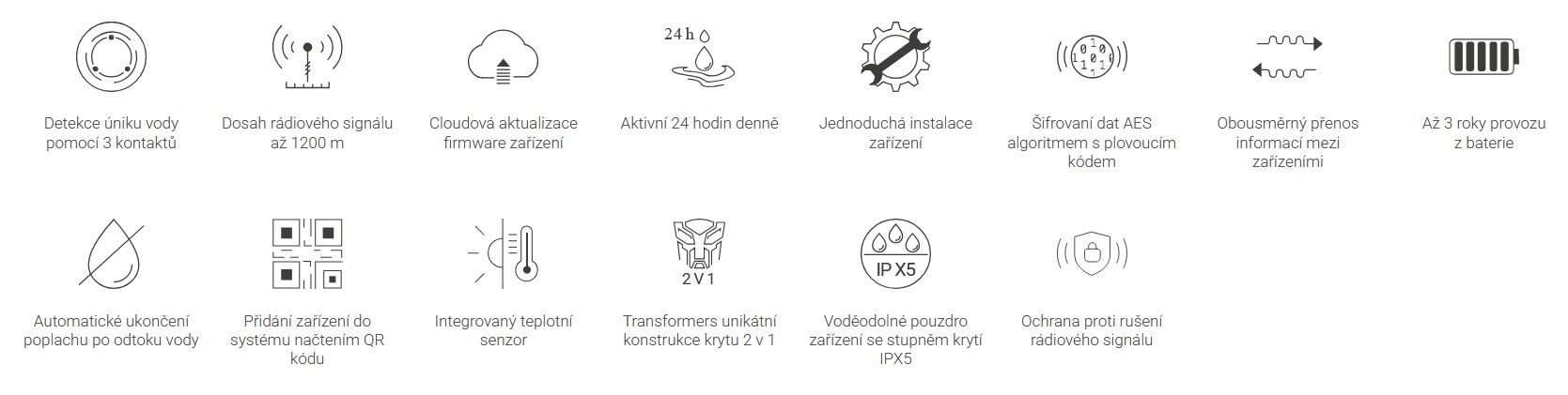 Bezdrátový detektor úniku vody, detektor je napájen vyměnitelnou baterií, která umožňuje nepřetržitý provoz až po dobu 3 let.
