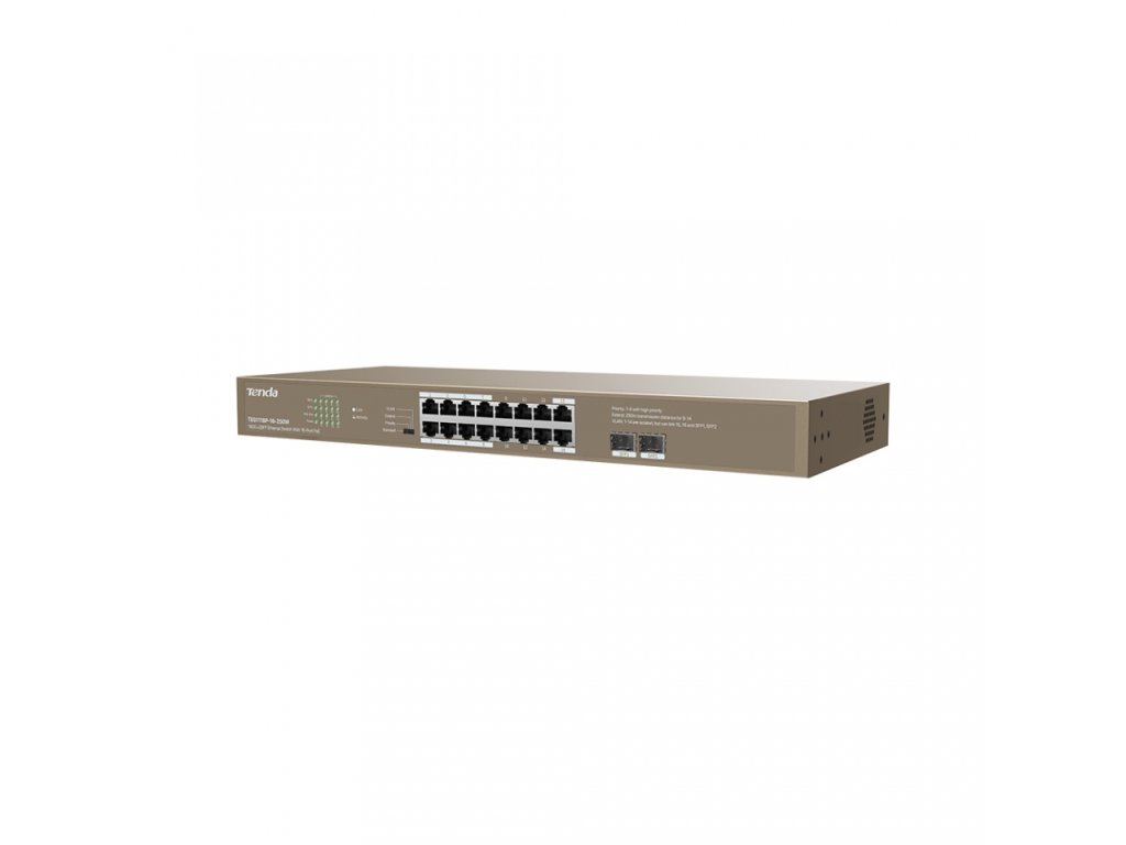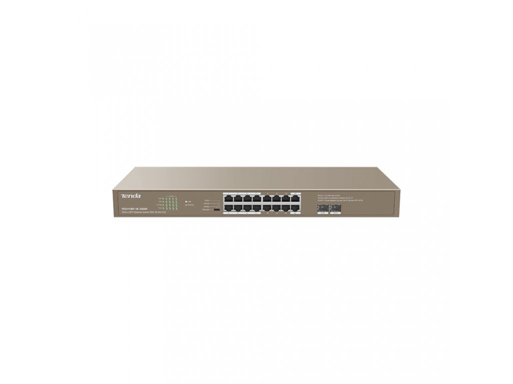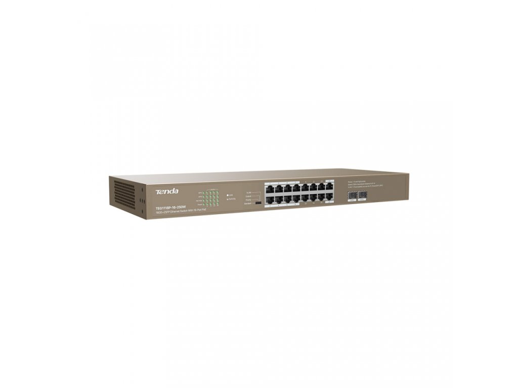 Tenda TEG1118P-16-250W přepíná data pomocí 16ti portů RJ45 a 2x SFP sloty, 16 portů 10/100/1000 Mb/s podporuje PoE802.3af/at. Switch má ochranu proti přepětí 6kV. Podpora přepojování uzlů v módu Store-and-Forward. Full-duplex kontrola toku 802.3x, half-duplex kontrola toku v režimu Back-Pressure.